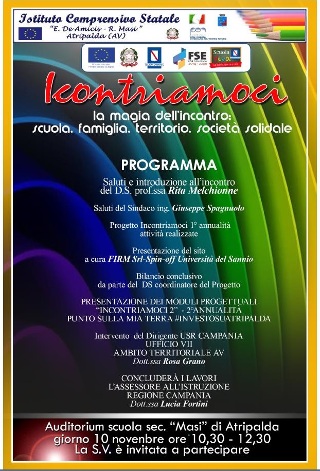 L’entusiasmo palpabile nella sala della scuola, trasmesso anche dalla Dirigente Scolastica Rita Melchionne, dalla presenza del Sindaco di Atripalda Giuseppe Spagnuolo, dai dirigenti scolastici di altre scuole limitrofe, dai rappresentanti delle Associazioni e partner del Progetto Scuola Viva, ovvero: FIRM Srl – Spin-off Università degli studi del Sannio, Consorzio dei Servizi Sociali A/5, Consorzio Irpino per la promozione della cultura, della ricerca e degli studi universitari, Centro di Cultura e volontariato “E. Aprea”, Associazione Teatro d’Europa ”Don Ferdinando Renzulli”, Associazione “Giancarlo Imbimbo” di Atripalda, Associazione Burundiamo. Ampia anche la presenza dei genitori, che ha contribuito a rendere giustizia al titolo del progetto portato avanti dall’Istituto nella scorsa annualità: “Incontriamoci”, creando quella Magia che ha dato il titolo all’incontro di ieri mattina.