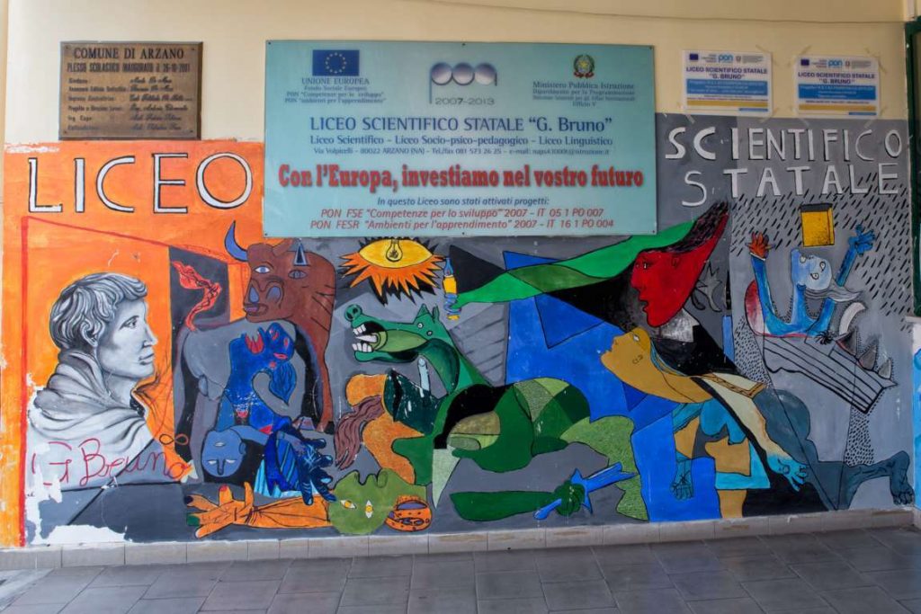Il progetto LABORATORIO GIORDANO BRUNO – SAPERE e SAPER FARE valorizza il protagonismo degli alunni; recuperato all’impegno coloro che manifestano disaffezione e scarsa motivazione; consolida la presenza attiva della scuola nella vita culturale e sociale (assai carente) del nostro territorio, che comprende, oltre Arzano e Grumo Nevano, diversi altri comuni situati nell’area a Nord-Ovest di Napoli. Il progetto si configura perciò – con i suoi otto moduli e i suoi sei partner, tutti già attivi sul territorio – non soltanto come azione didattica e culturale tesa a prevenire e recuperare le spinte all’abbandono e alla dispersione scolastica presenti tra i nostri alunni, ma anche come “contrasto attivo” alle dinamiche di marcescenza che caratterizzano più complessivamente i nostri contesti urbani. Attraverso la pratica organizzativa, culturale e didattica della “scuola aperta” (intesa, appunto, come laboratorio permanente di ricerca, sperimentazione e innovazione, e soprattutto come apertura al territorio e educazione alla cittadinanza attiva) intendiamo costruire giorno per giorno un “luogo aperto” di cultura e creazione artistica, che funga da esempio positivo anche per le fasce poco scolarizzate della popolazione.