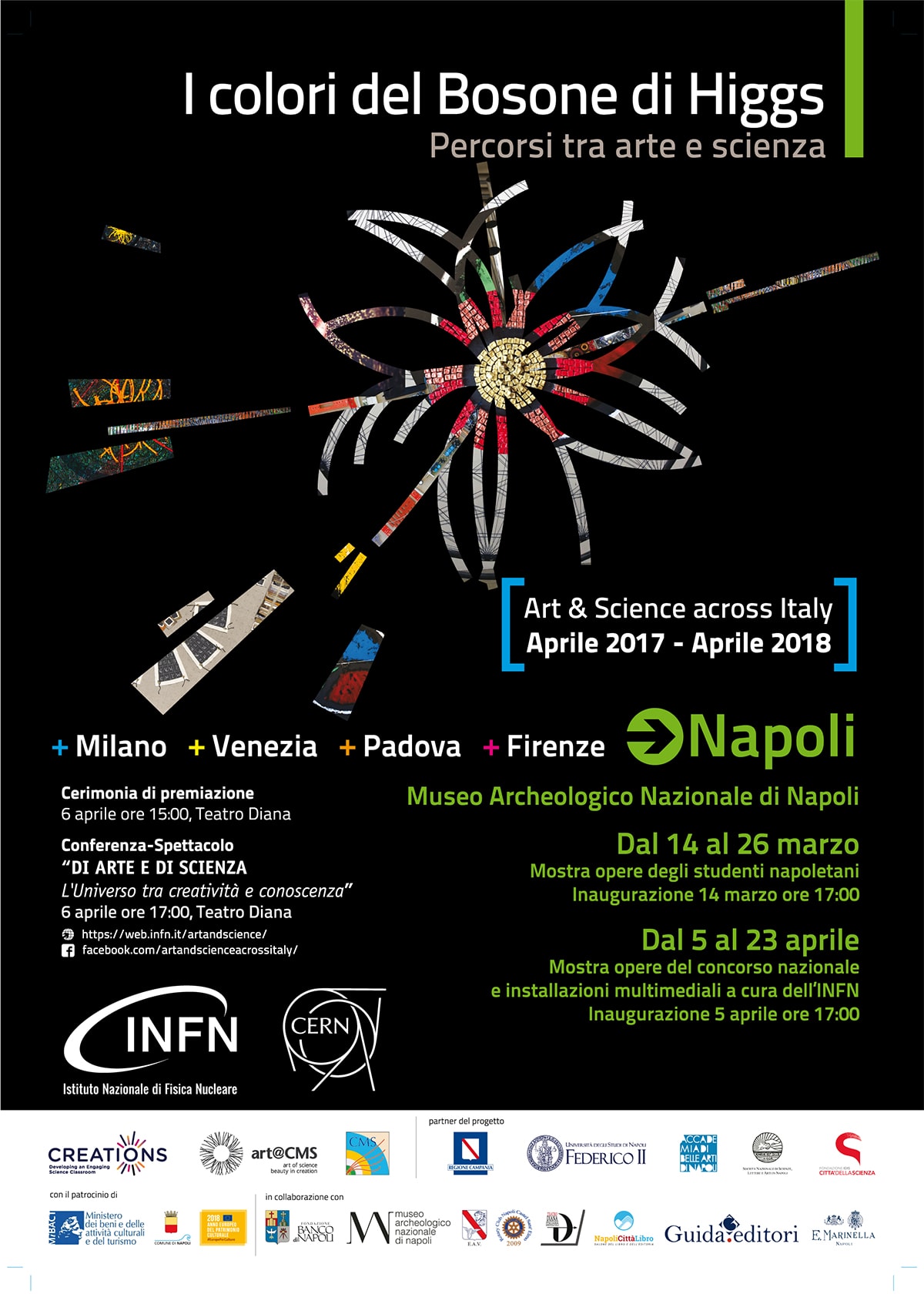 Ma, esattamente, cos’è e come si è articolato “Art and Science across Italy” in questi due anni? L’ambizioso progetto si è sviluppato, in più fasi: una prima formativa, durante la quale sono stati organizzati dei seminari e incontri con gli studenti per introdurre i concetti di base della fisica delle particelle elementari e illustrare le attività di ricerca svolte dall’INFN e dal CERN di Ginevra. Durante la seconda fase, denominata creativa, gli studenti hanno realizzato delle composizioni artistiche ispirate agli argomenti scientifici affrontati durante la prima fase. Le migliori composizioni artistiche, selezionate da una commissione internazionale, sono state esposte nella mostra itinerante denominata “I colori del Bosone di Higgs”, che in uno con la collezione artistica art@CMS e una installazione multimediale interattiva chiamata “il dono della massa” realizzata dall’INFN sono esposte al