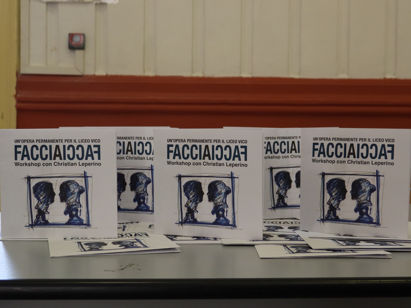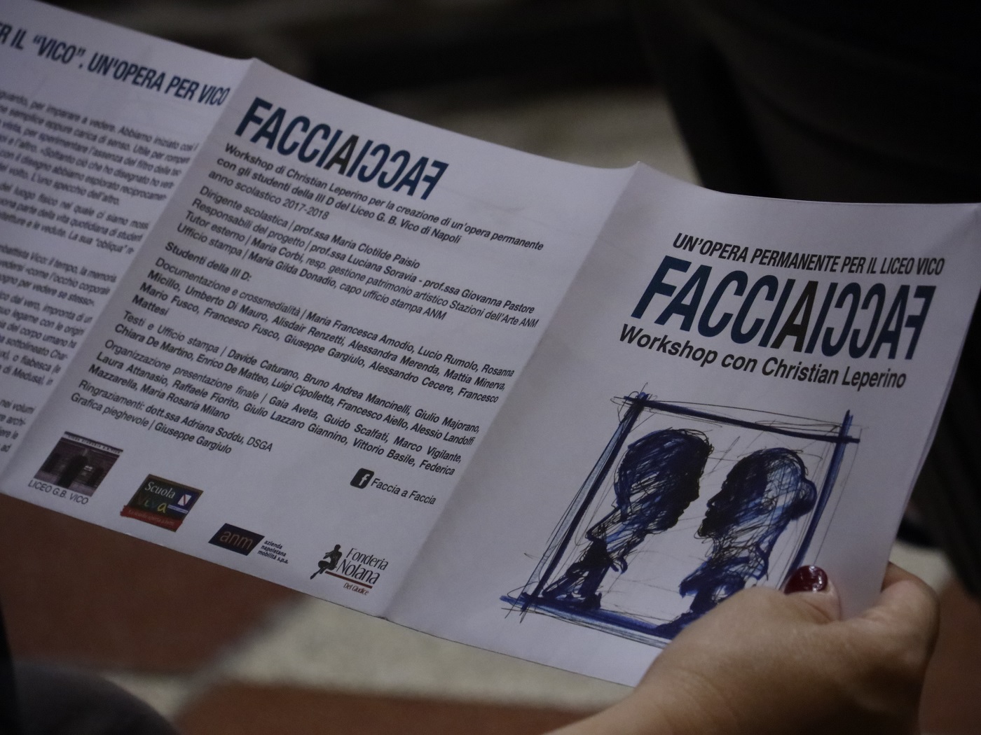 Tantissima arte contemporanea nella seconda annualità del programma “Scuola Viva” del Liceo Giambattista Vico di Napoli, che si è conclusa in data 15 Giugno 2018 con l’inaugurazione dell’opera site-specific dal titolo “Faccia a Faccia”, risultato del lavoro svolto dai ragazzi della III D affiancati dalla mano esperta dell’artista Christian Leperino.