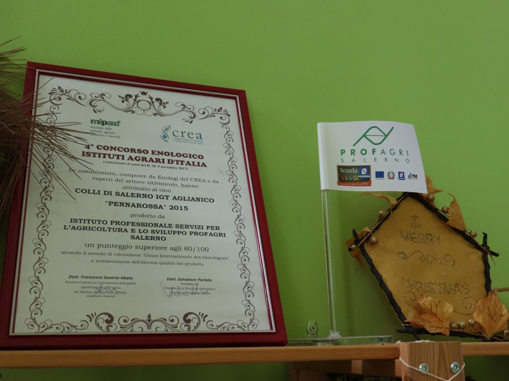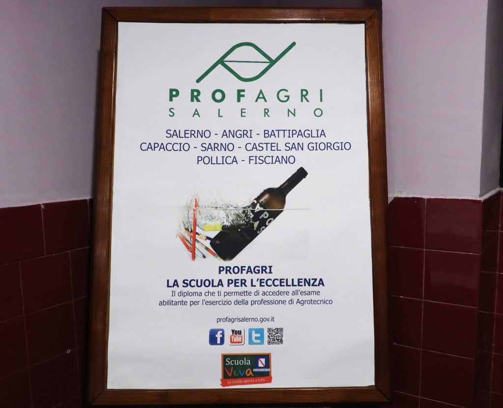 Ebbene si, perché il PROFAGRI non è soltanto una scuola ma anche un’Azienda Agraria, il cui terreno agricolo è pari a circa 18 ettari, dislocati fra Salerno, Battipaglia e Capaccio. A Capaccio, località Gromola, è presente la vigna da cui, grazie a Scuola Viva si ottengono vini Capoclasse e Penna Rossa, un Fiano ed un Aglianico che vengono venduti al pubblico negli store presenti in due sedi scolastiche.