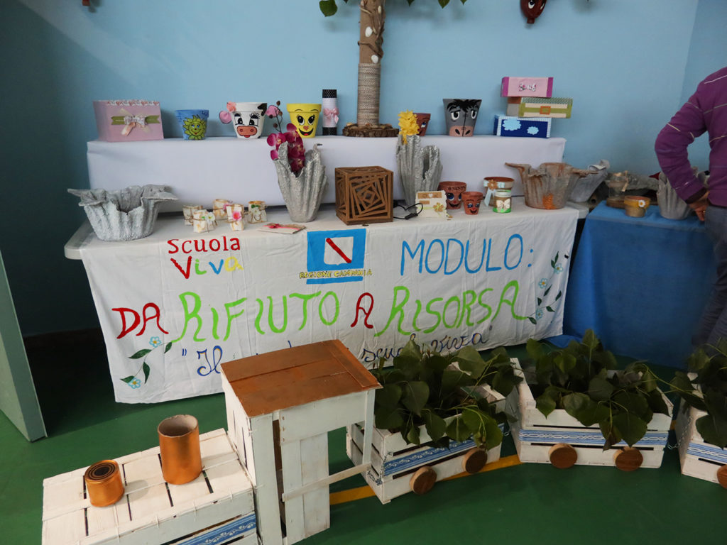 “Armonica-mente, ovvero percorsi educativi e di libertà nel Cilento” è il titolo del progetto che ha coperto tutte le tre annualità, che quest’anno ha sviluppato 7 moduli, tutti con un importante valore di fondo: l’ecosostenibilità, il rispetto per l’ambiente e per la vita. È così che nascono gli strumenti dell’orchestra dei giovani musicisti del riciclo che, come raccontano Preside e insegnati, ormai si esibiscono in tutto il comprensorio con tamburi, ukulele e strani strumenti tubolari ricavati da scatole di biscotti, latte legate con lo spago, tubi di plastica, tutti frutto del modulo “Musica e Riciclo”. E poi ci sono le elegantissime pochette ricavate dalle buste del caffè, meravigliosi vasi che sembrano di uno strano cristallo e invece sono fatti di cemento! Oppure le cornici create con le pagine dei giornali che altrimenti sarebbero stati buttati via e i trenini portafiori creati con le cassette della frutta e le vecchie lenzuola diventano delle comode borse della spesa dal messaggio eloquente: “Dite addio alla plastica!”.