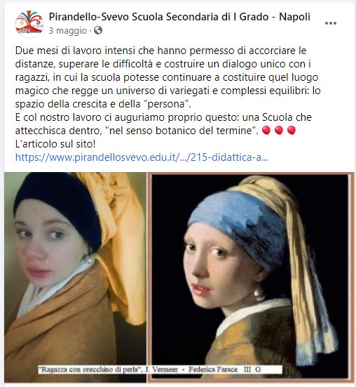 I protagonisti si sono divertiti molto coinvolgendo i familiari e regalando a tutti tanto buonumore. Due mesi di lavoro intensi che hanno permesso di accorciare le distanze, superare le incredibili difficoltà e costruire un dialogo unico con i ragazzi”. Particolarmente apprezzate le riproduzioni casalinghe di: “I giocatori di carte” di Cezanne realizzato da un alunno con l’ausilio paziente del nonno; “Ritratto di uomo con turbante rosso” di Van Eyck in cui il turbante è stato sostituito da un asciugamano da bagno e “Giovane con canestra di frutta” in cui armato di mele ed arance un somigliantissimo studente fa rivivere l’arte unica di Caravaggio. (Tutta la galleria su https://www.pirandellosvevo.edu.it/index.php/accesso-rapido/lista-delle-news-principali/215-didattica-a-distanza-3-appuntamento-con-le-realizzazioni-dei-nostri-alunni)