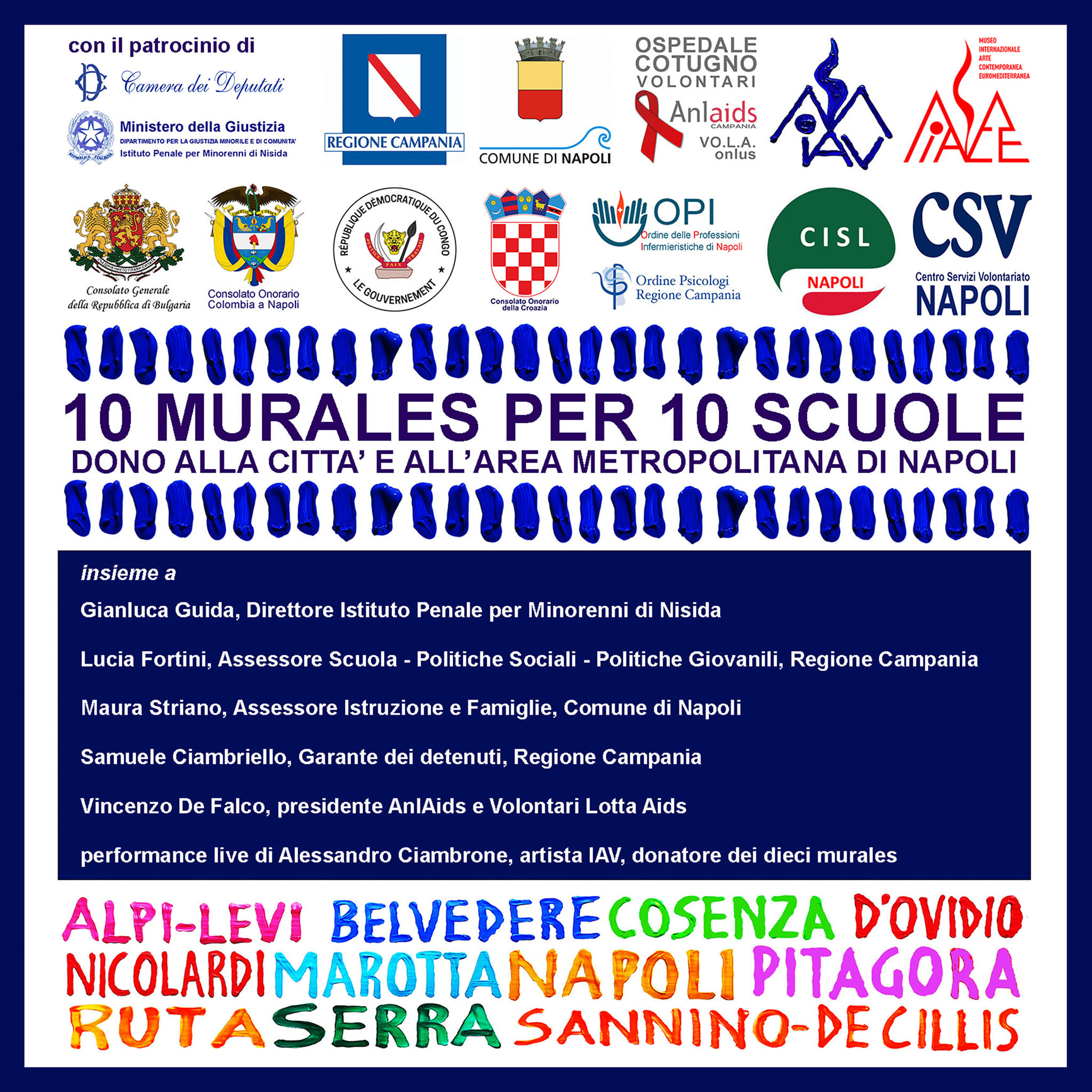 Il progetto “10 murales per 10 scuole” presentato al Centro Studi del Penitenziario per minori di Nisida. Un progetto dono alla Città e all’Area Metropolitana di Napoli, a cura di Alessandro Ciambrone, artista del polo artistico-culturale In Arte Vesuvio, e Vincenzo De Falco, Presidente di Anlaids Campania e V.O.L.A., l’associazione dei volontari ospedalieri lotta AIDS.