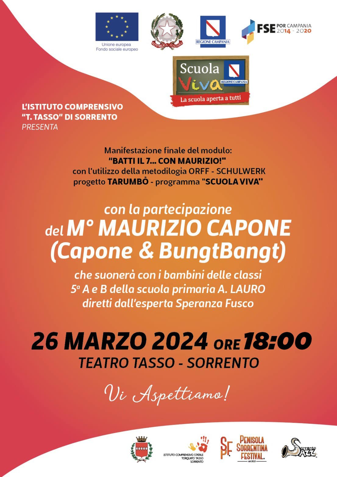 La manifestazione finale del modulo dal titolo “Batti il 7… con Maurizio”, si è tenuta il 26 marzo 2024, presso il Teatro Sasso di Sorrento. I bambini – diretti dall’esperta Speranza Fusco – hanno avuto, così, l’occasione di suonare con il Maestro Maurizio Capone della Capone & BungtBangt.