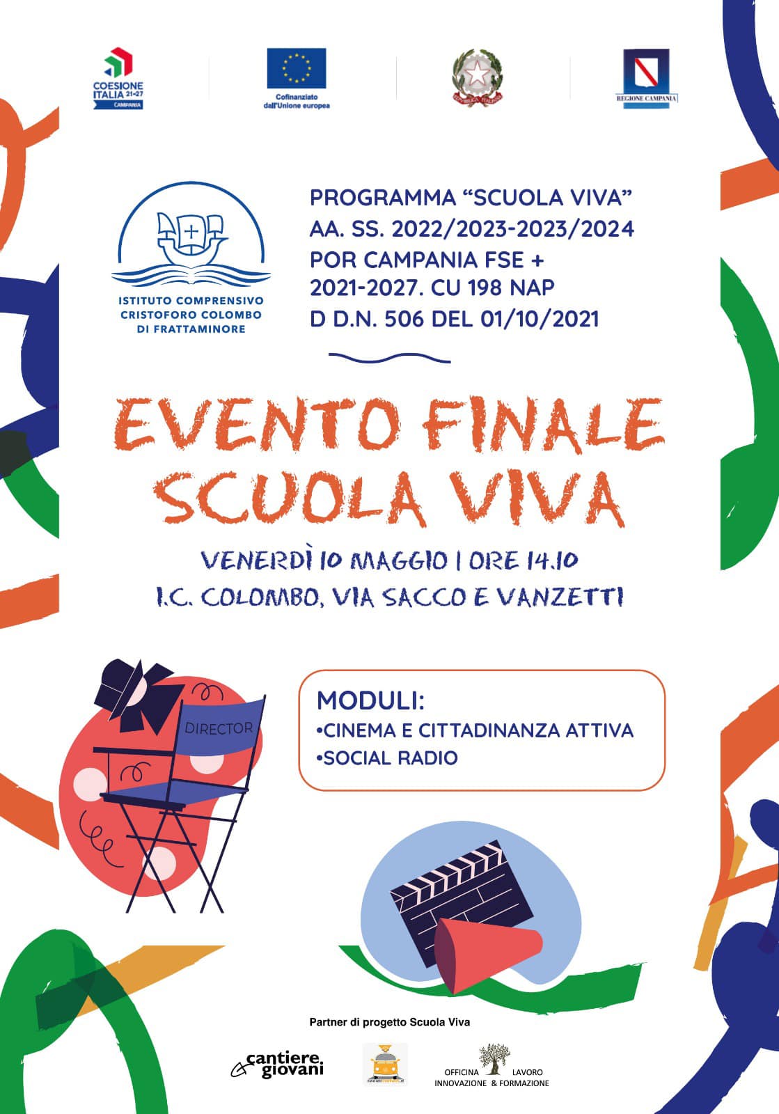 Venerdì 10 maggio 2024, presso la stessa scuola, si è tenuta la manifestazione finale del Progetto. E questa ha riguardato, in particolare i moduli 5 e 3, rispettivamente intitolati “Cinema e cittadinanza attiva” e “Social radio”.