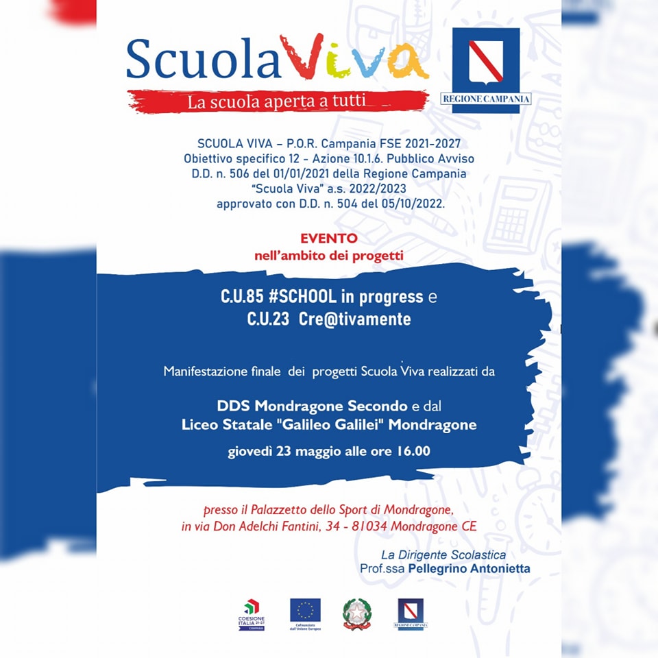 Home » Attività » DDS MONDRAGONE SECONDO E LS GALILEI, MANIFESTAZIONE FINALE PER I DUE PROGETTI SCUOLA VIVA
