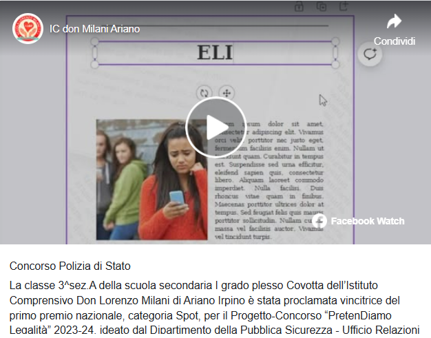La classe III A della scuola secondaria I grado, plesso Covotta, ha vinto il primo premio nazionale, per il Progetto-Concorso “PretenDiamo Legalità” 2023-24, nella categoria Spot. Ad ideare il Progetto-Concorso, il Dipartimento della Pubblica Sicurezza – Ufficio Relazioni Esterne Cerimoniale e Studi Storici, in collaborazione con il Ministero dell’Istruzione e del Merito. Quest’anno, il concorso è giunto alla sua settima edizione.