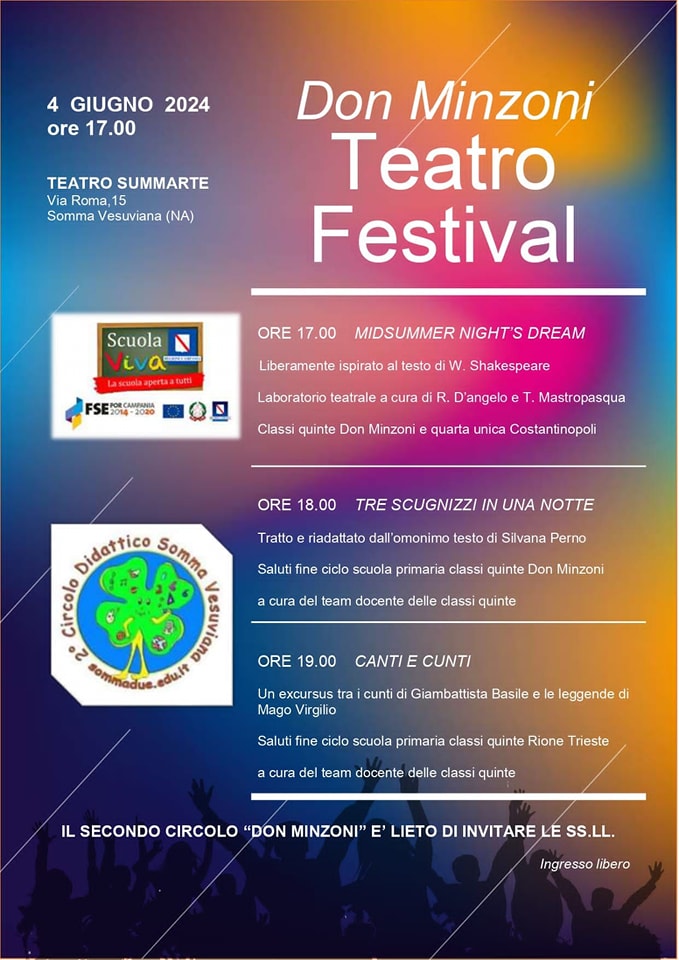 La manifestazione finale si è tenuta il 4 giugno 2024, presso il Teatro Summarte. E si è svolta in tre momenti diversi, che hanno visto gli alunni cantare, ballare, recitare e raccontare con allegria ed originalità il proprio territorio e le sue tradizioni. Il primo, dal titolo “Midsummer night’s dream”, liberamente ispirato al testo di William Shakespeare. Il secondo, dal titolo “Tre scugnizzi in una notte”, tratto e riadattato dall’omonimo testo di Silvana Perno. In fine, “Canti e cunti”, un excursus tra i racconti di Giambattista Basile e le leggende di Mago Virgilio.