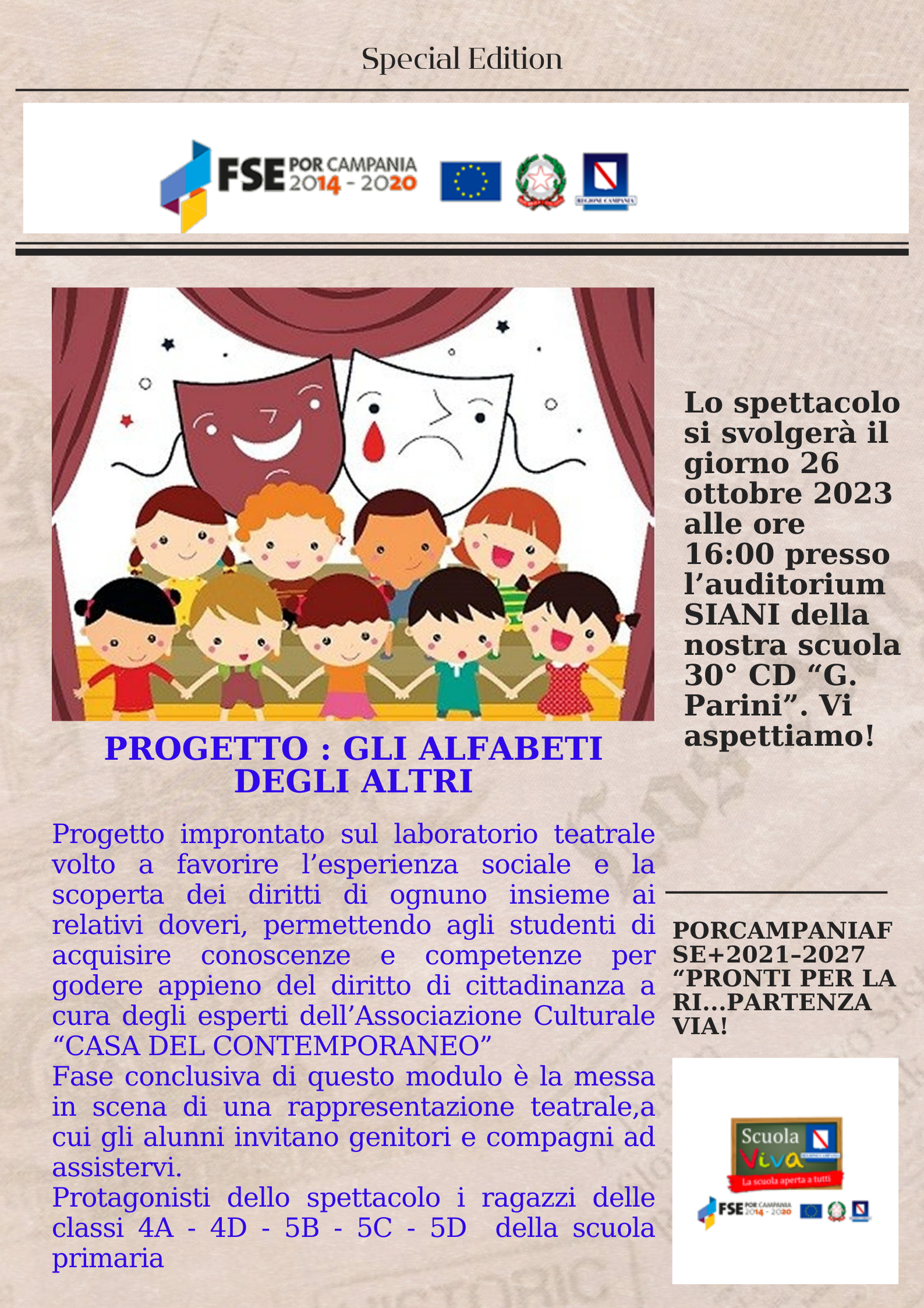 - MODULO 5 – GLI ALFABETI DEGLI ALTRI: LABORATORIO TEATRALE INTERATTIVO SULL’ACCETTAZIONE DELLA DIVERSITÀ. Questo laboratorio teatrale ha voluto favorire l’esperienza sociale la scoperta dei diritti di ognuno insieme ai relativi doveri. Ed ha permesso agli studenti di acquisire conoscenze e competenze, per godere appieno del diritto di cittadinanza a cura degli esperti dell’Associazione Culturale “CASA DEL CONTEMPORANEO”. La fase conclusiva di questo modulo ha visto la messa in scena di una rappresentazione teatrale. Protagonisti dello spettacolo i ragazzi delle classi IV A, IV D, V B, V C e V D della scuola primaria. A questa, hanno potuto assistere i genitori degli alunni coinvolti, ma anche l’intera comunità scolastica.