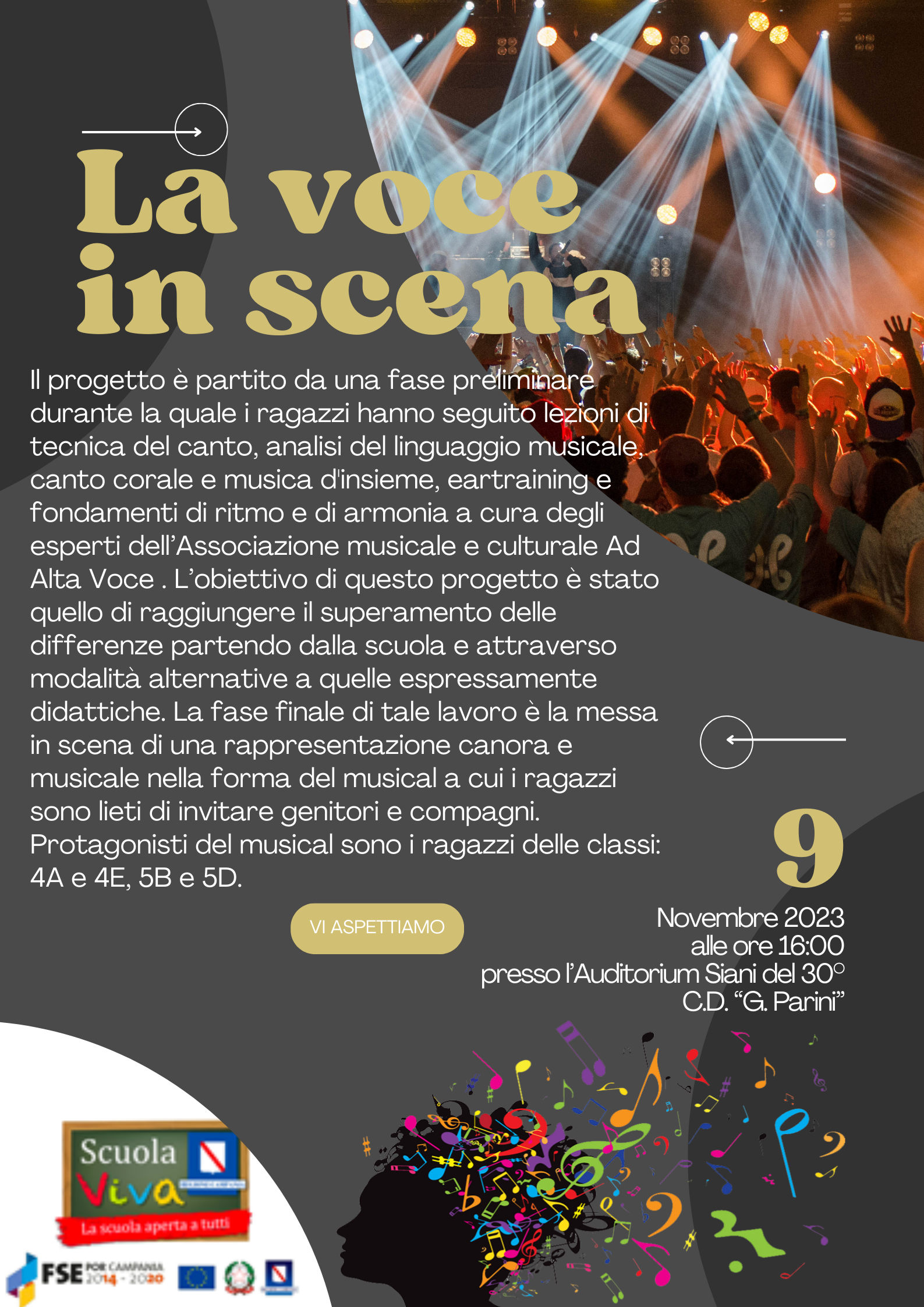 - MODULO 1 – LA VOCE IN SCENA. L’obiettivo è stato il superamento delle differenze, partendo dalla scuola e attraverso modalità alternative a quelle tradizionalmente didattiche. La fase finale di tale lavoro è stato la messa in scena di una rappresentazione canora e musicale nella forma del musical. Questa si è tenuta giovedì 9 novembre 2023, presso l’Auditorium Siani della stessa scuola, ed ha visto protagonisti del musical sono i ragazzi delle classi IV A, IV E, V B e V D.