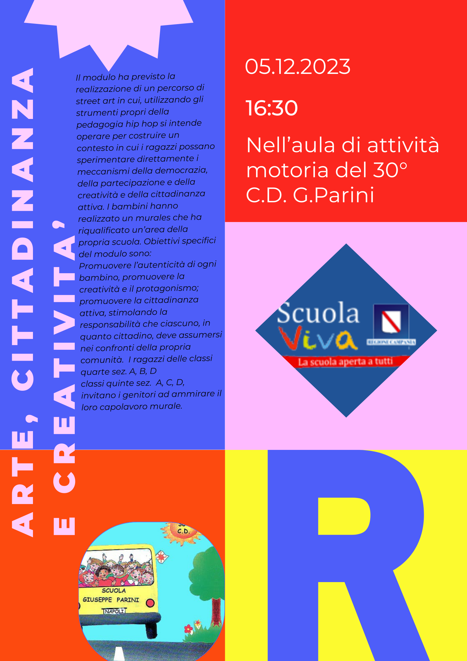 - MODULO 3 – ARTE CITTADINANZA E CREATIVITÀ. Il modulo ha previsto lo realizzazione di un percorso di street art in cui, utilizzando gli strumenti propri della pedagogia hip hop, si è voluto operare per costruire un contesto in cui i ragazzi hanno potuto sperimentare direttamente i meccanismi della democrazia, della partecipazione, della creatività e della cittadinanza attiva. I bambini hanno realizzato un murales che ha riqualificato un’area della propria scuola. Obiettivi specifici del modulo sono stati: promuovere l’autenticità di ogni bambino, promuovere la creatività e il protagonismo, promuovere la cittadinanza attiva, stimolare il senso di responsabilità che ciascuno, in quanto cittadino, deve assumersi nei confronti della propria comunità. I genitori degli alunni e la comunità scolastica sono stati invitati ad ammirare il murale realizzato dai ragazzi delle classi quarte, sez. A, B, D, classi quinte sez. A, C, e D, il 5 dicembre 2023, presso l’aula attività motorie della stessa scuola.