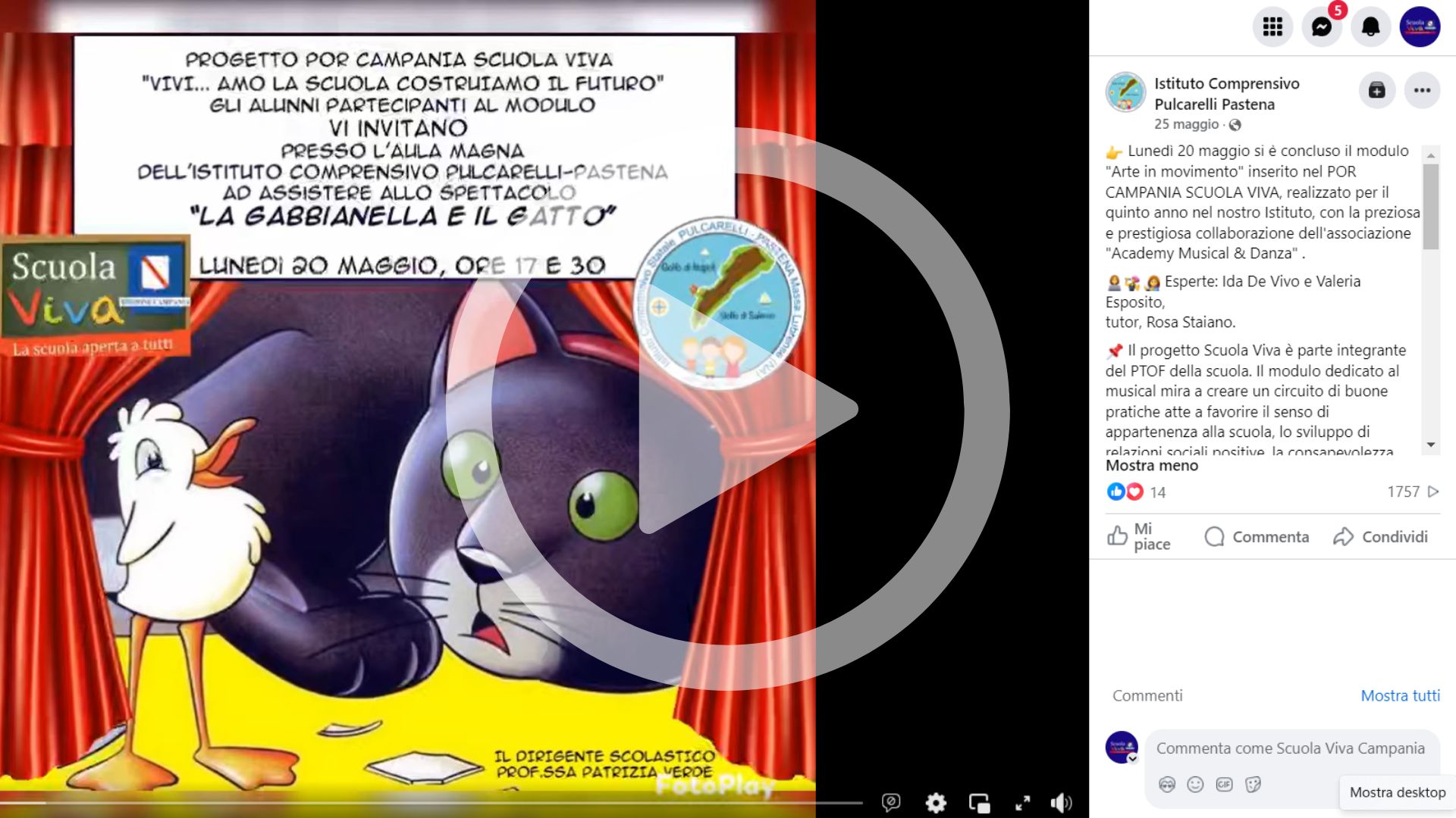 La manifestazione finale del progetto “Vivi…amo la scuola – Costruiamo il futuro” si è tenuta lunedì 20 maggio 2024. L’evento ha visto la messa in scena dello spettacolo “La gabianella e il gatto“, con adattamento, regia e direzione a cura dell’ente partner “Academy Musical & Danza”. Spettacolo che ha permesso agli alunni partecipanti di condividere, con divertimento, i risultati delle attività laboratoriali con l’intera comunità scolastica.