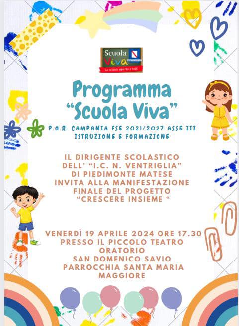 In questo caso, parliamo dell’IC Ventriglia di Piedimonte Matese che ha svolto la manifestazione finale del Progetto “CRESCERE INSIEME” il 19 aprile 2024, presso Il Piccolo Teatro Oratorio San Domenico Savio.