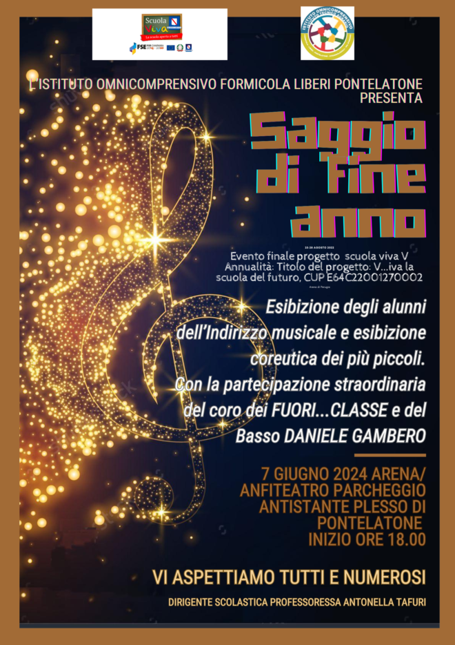 Gli alunni dell’indirizzo musicale hanno formato un’orchestra coinvolgendo anche ex alunni dell’Istituto ed ex docenti. Le performance sono state organizzate con un omaggio a Morricone: un medley delle più celebri colonne sonore di Ennio Morricone eseguito dall’Orchestra e Coro Fuoriclasse, includendo capolavori come “Il buono, il brutto, il cattivo”, “Per un pugno di dollari” e “C’era una volta il West”; un Medley Napoletano interpretato dal basso Daniele Gambero con l’accompagnamento dei maestri; Granada eseguita dai professori e Daniele Gambero; Grande amore e Volare interpretate dai professori, il Coro Fuoriclasse, il Coro degli Alunni, Daniele Gambero, e gli alunni della scuola primaria.