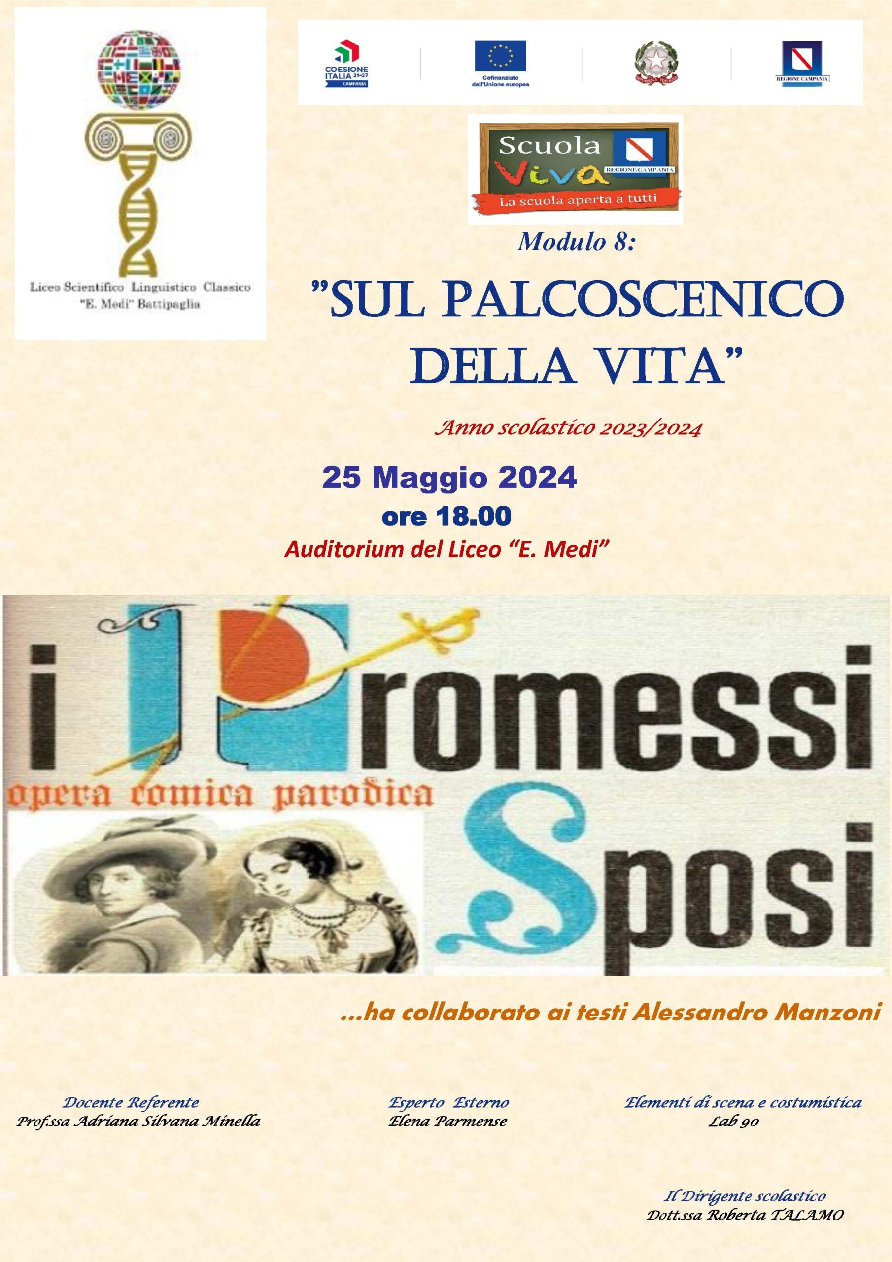 La giornata conclusiva del MODULO 8 – SUL PALCOSCENICO DELLA VITA si è tenuta sabato 25 maggio 2024, con la messa in scena dello spettacolo “I Promessi Sposi”. L’evento è stato l’occasione per studentesse e studenti, accompagnati dai docenti e tutor, di mettere in mostra le abilità sviluppate nel corso delle attività laboratoriali svolte e di condividerne, con entusiasmo, i risultati con l’intera comunità scolastica. Di seguito, le foto ed i video realizzati dalla scuola, utili a raccontare l’evento.