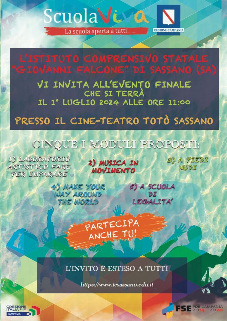 La manifestazione finale si è tenuta il 1° luglio 2024, presso il Cine-Teatro “Totò” di Sassano. Alla presenza di tutta la comunità scolastica e territoriale, delle famiglie e dei genitori, i partecipanti hanno condiviso i risultati delle attività laboratoriali.