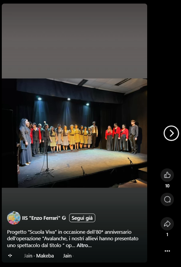 I moduli di teatro hanno avuto, come obiettivo finale, la messa in scena di un vero e proprio spettacolo teatrale. In occasione dell’80° anniversario dell’operazione Avalanche, i ragazzi hanno presentato uno spettacolo teatrale dal titolo Operazione Avalanche drammatizzazione storica, con la direzione artistica di Elena Parmense e la regia di Gaetano Stella. Uno spettacolo che ha riscosso un grande successo e che ha visto i partecipanti ai moduli impegnati nella organizzazione e realizzazione dell’evento. Dalla recitazione al ballo, alla scenografia e ai costumi di scena: hanno curato ogni dettaglio della rappresentazione.
