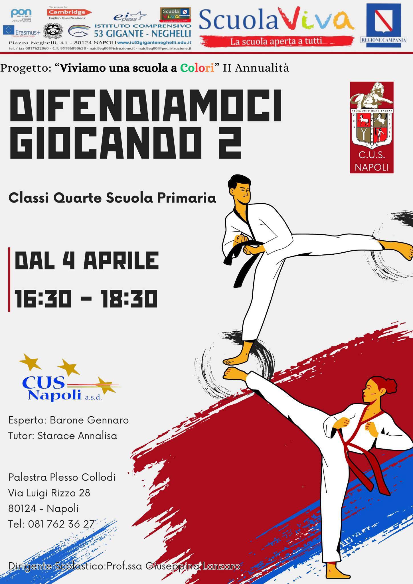 A partire da venerdì 4 aprile, gli alunni delle classi quarte dei plessi Neghelli e Collodi avranno la possibilità di partecipare al modulo formativo presso la palestra del plesso Collodi. Il laboratorio, in collaborazione con il CUS Napoli, offrirà agli studenti strumenti utili per sviluppare capacità motorie e di autodifesa in un contesto ludico e formativo.