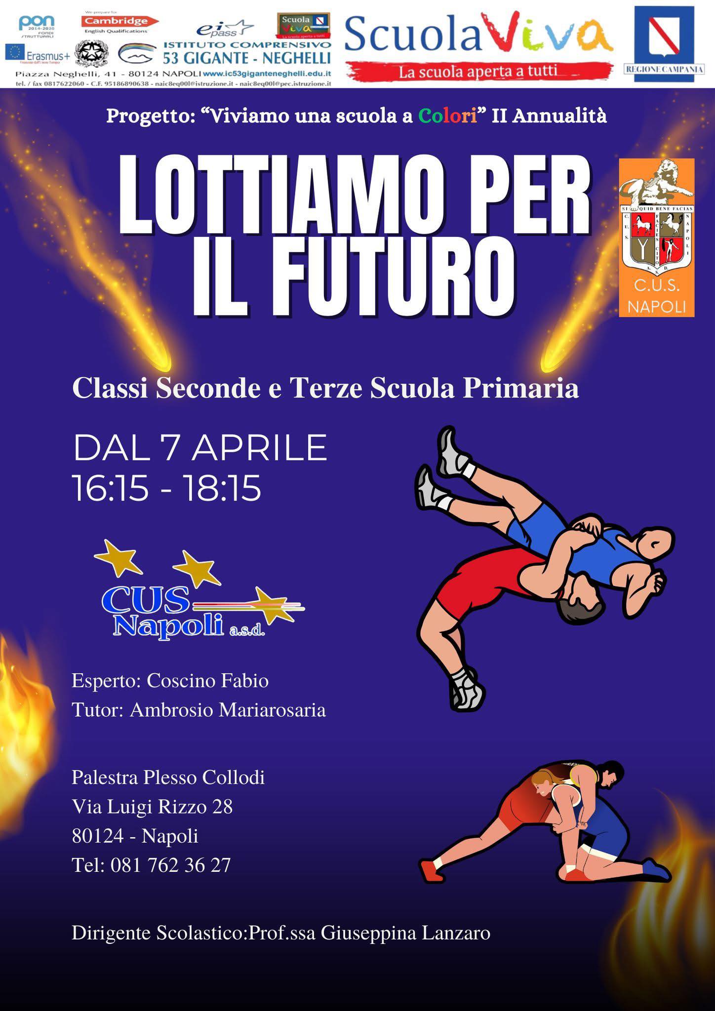 A partire da lunedì 7 aprile, gli alunni delle classi seconde e terze dei plessi Neghelli e Collodi della scuola primaria potranno partecipare al modulo formativo LOTTIAMO PER IL FUTURO. Questo modulo viene realizzato presso la palestra del plesso Collodi, in collaborazione con il CUS Napoli. L’iniziativa mira a sviluppare il senso di collaborazione e il rispetto reciproco attraverso lo sport.