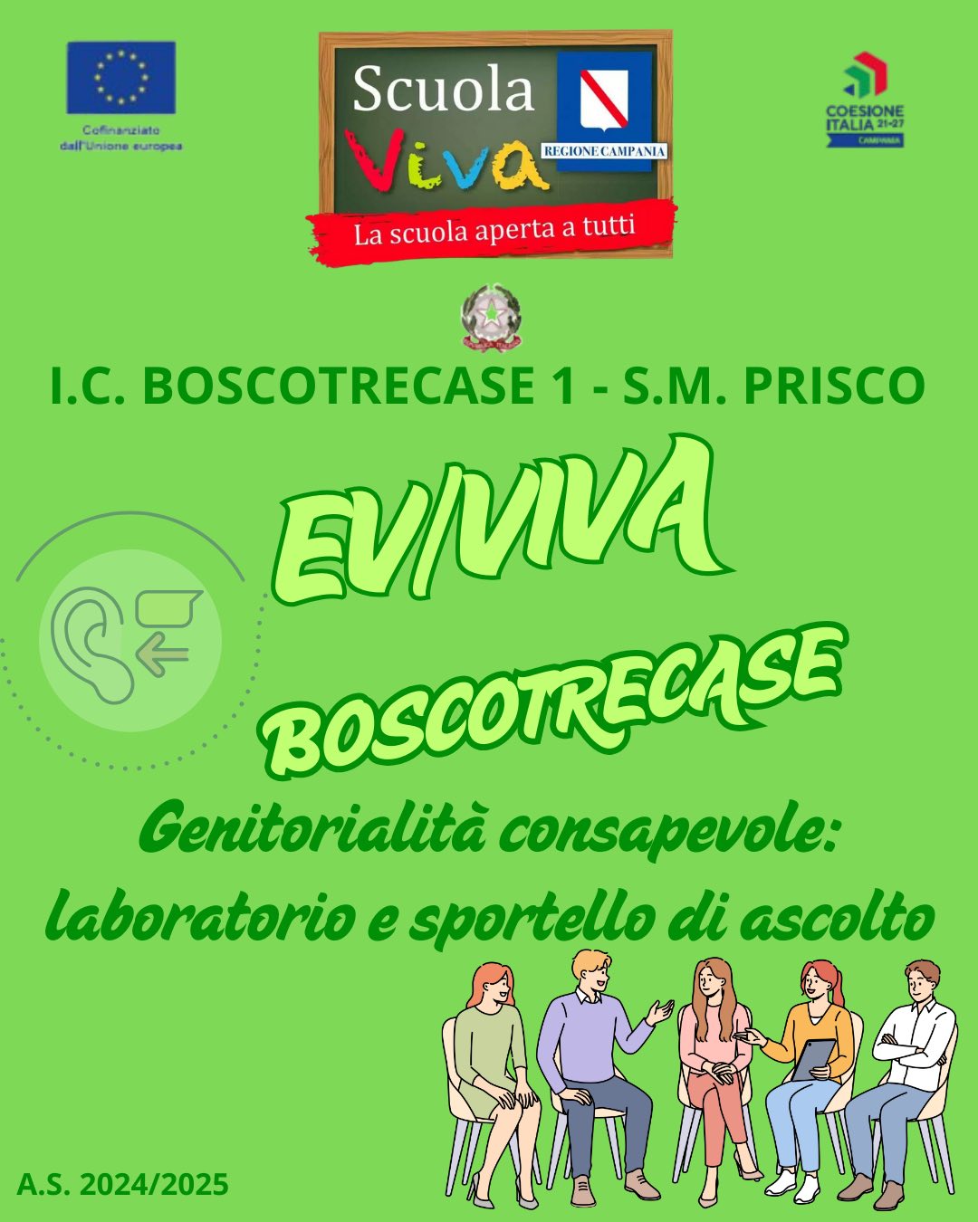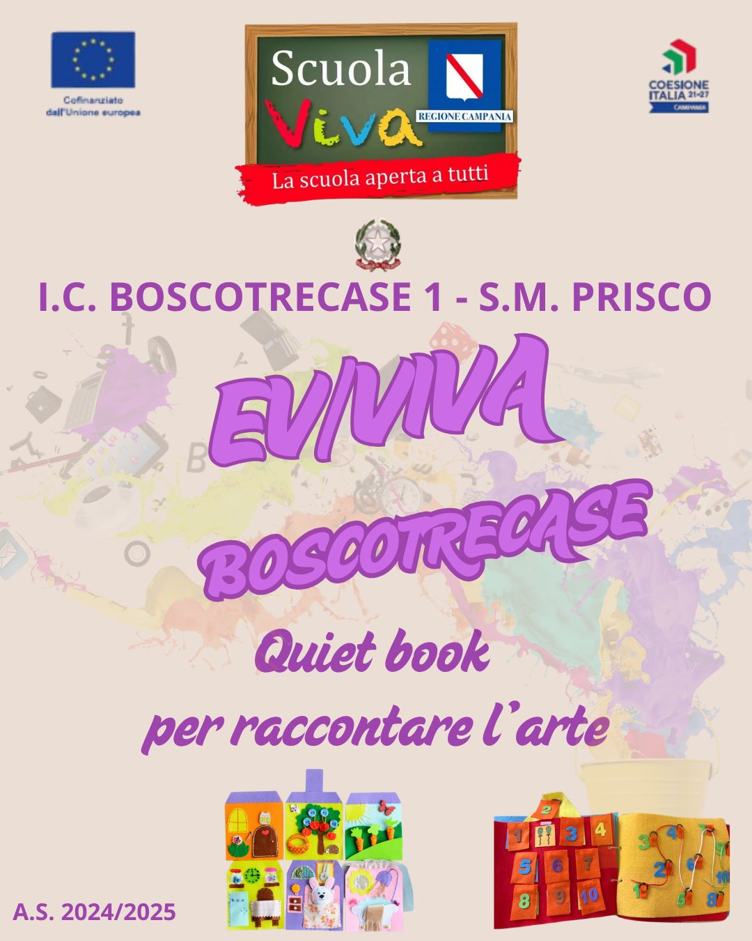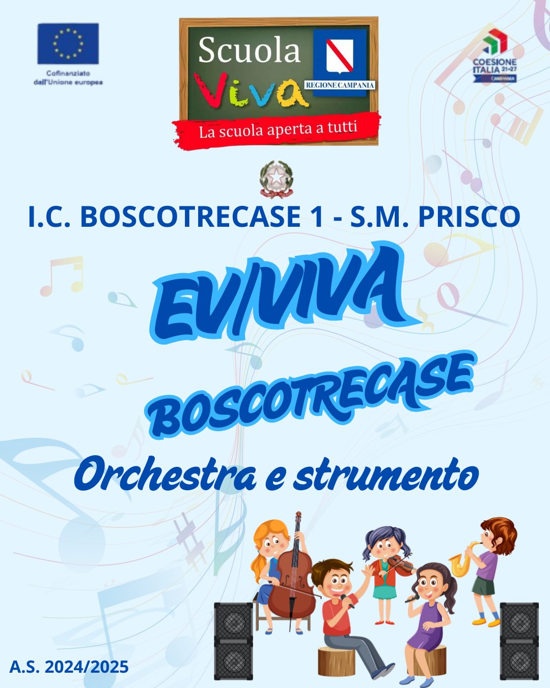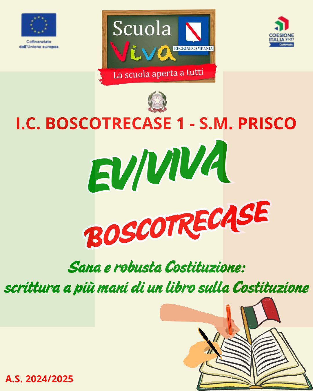 All’IC 1 Prisco di Boscotrecase, con entusiasmo e tante novità, prende il via il progetto EV/VIVA BOSCOTRECASE della II annualità del Programma Scuola Viva 2021-2027 della Regione Campania. Un progetto che trasforma la scuola in un laboratorio permanente di crescita, arte, emozioni e partecipazione attiva. Sei moduli coinvolgenti accompagneranno studenti e genitori in un viaggio educativo ricco di stimoli e significato.